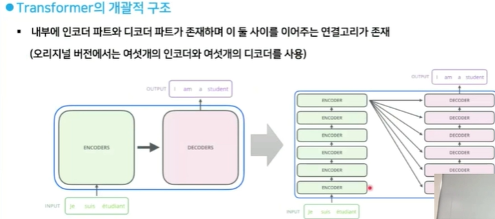 내부에 인코더 파트와 디코더 파트가 존재하고, 이 둘 사이를 이어주는 연결고리가 존재합니다. 쉽게 설명하면, 왼쪽 부분인 인코더는 컴퓨터가 이해할 수 있도록 해주고, 오른쪽 부분인 디코더에서 사람이 잘 이해할 수 있는 답변을 생성해주는 구조입니다. 이런 인코더와 디코더를 연결하는 것이 Attention 메커니즘이라 합니다.