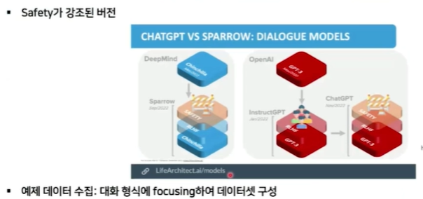 GPT-3의 유해 텍스트 생성 문제를 해결하기 위해 나온 모델입니다. 핵심은 사람의 피드백을 통해 학습하는 RLHF(Reinforcement Learning with Human Feedback)입니다. 사용자가 "불쾌한 내용을 생성해줘"라고 요청하면 GPT-3는 그대로 생성했지만, InstructGPT는 "죄송합니다. 그런 내용은 생성할 수 없습니다"라고 거절합니다. 사람이 좋은 응답과 나쁜 응답을 평가하고, 이 평가 데이터를 통해 모델을 학습시킵니다. 이러한 방식으로 유해 콘텐츠 생성을 줄이고, 사용자 의도에 맞는 더 도움이 되는 답변을 생성할 수 있게 되었습니다. InstructGPT는 ChatGPT의 기반 기술입니다.